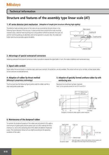 TechnicalInformationStructureandfeaturesoftheassemblytypelinearscale(AT)1.ATseriesdetectorjointmechanism(Adoptionofsimplejointstructureofferinghighrigidity)Thedetectorheadandslider(sensor)ofthescaleunitareconnectedbythejointshowninthefollowingfigure.Becauseofthisstructure,ifvaluesarelessthanorequaltothescalemountingstandardvalues,detectorheadmountingerrorsandparallelismdifferencesbetweenthescaleunitandthemachineguidewayareabsorbed,andnormaloperationisassured.Also,thesimpleandhighlyrigidstructureprovidessuperiordurability.Slider(sensor)CouplingrodCouplingspringDetectorhead2.AdvantageofspecialwaterproofconnectorsAdoptingwaterproofandoilproofconnectorsmakesitpossibletoseparatethesignalcable.Inturn,thismakesinstallationandmaintenanceeasy.3.SignalcableconduitSignalcablesthatareenclosedinastainless-steel,spiralcover(conduit),forprotection,arealsoavailable.Theconduitwillnotrustorcorrode,sothesesignalcablescanbeusedoveranextendedperiod.4.Adoptionofrubberlipthrustmethod(Mitutoyo'sproprietarytechnology)5.AdoptionofspeciallyformedurethanerubberlipwithreinforcingwireThethrustpart(seethefollowingfigure)pushesasidetherubberseallikeaship'skeelpushesasidewater.Resistancetooilanddusthasbeenimproved.Note:CanbespeciallyorderedfortheAT113andAT211.WithoutwireWithwireWire432longation(%)1E1251020Rubberlipshape30(Days)ElongationofdustproofrubberagainstcoolantexposureApplygrease.Scaleunit15mmmax.DetectorheadDustproofrubberSoakcloth,paper,orothersimilarmaterialinsiliconegrease,andthenapplytotheentirelengthofthecontactingarea.6.MaintenanceofthedustproofrubberTomaintainthedustproofpropertyoftherubbersealandextenditslife,applyasmallamountofgood-qualitysiliconegrease(suchasG-30LmadebyShin-EtsuChemicalCo,Ltd.)tothecontactingareaoftherubberanddetectorheadonceayear.(Themaintenanceintervalwillvaryslightlyaccordingtotheoperatingconditionsofthescale.)8-55